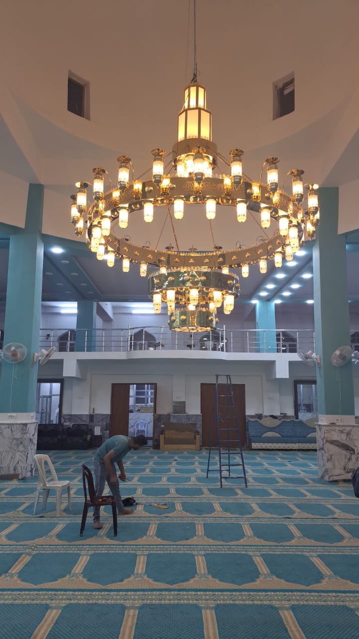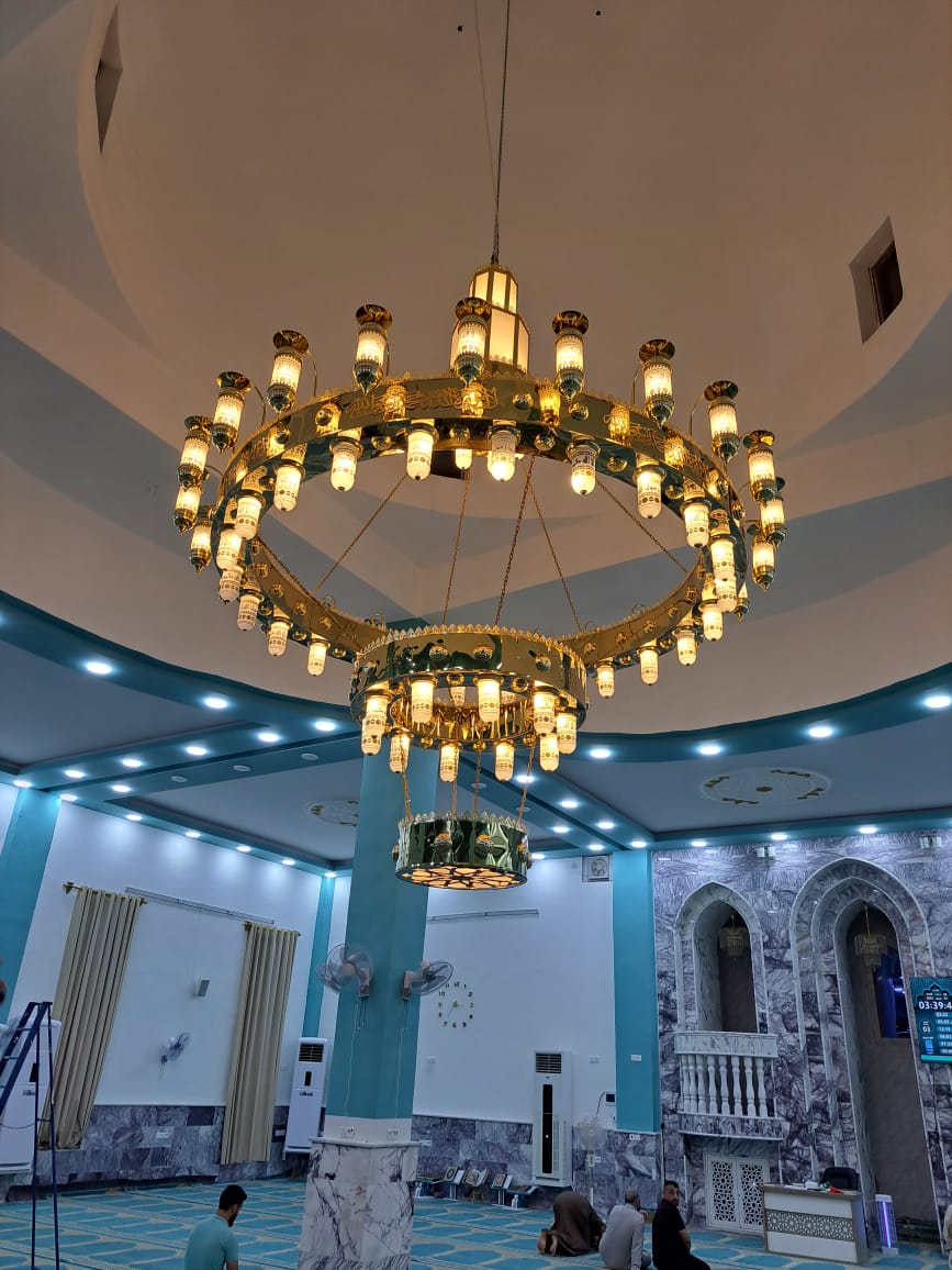 Custom-designed chandeliers that beautifully illuminate the Al-Qaem Mosque, merging tradition with modern lighting technology.